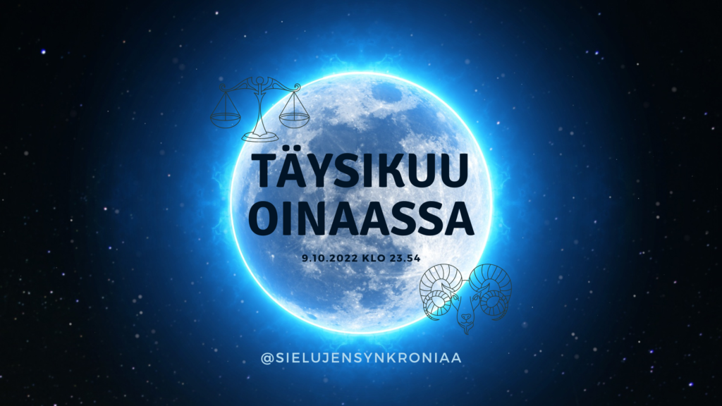 Alkuun hauska symmetrinen päivämäärähavainto: edellinen täysikuu oli Kaloissa 10.9. ja nyt käsillä oleva Oinaan täysikuu osuu sunnuntain 9.10. viime minuuteille 23.54 meillä Suomen aikavyöhykkeellä. Kuten täysikuun aikaan aina, on aika taas katsoa vallitsevasta ajasta (Aurinko Vaa’assa) aivan vastakkaiseen suuntaan (Kuu Oinaassa). Jos Aurinko meissä edustaa sydäntämme, sisintä tietoista olemustamme, suuntaamme ja tarkoitustamme tässä elämässä, […]